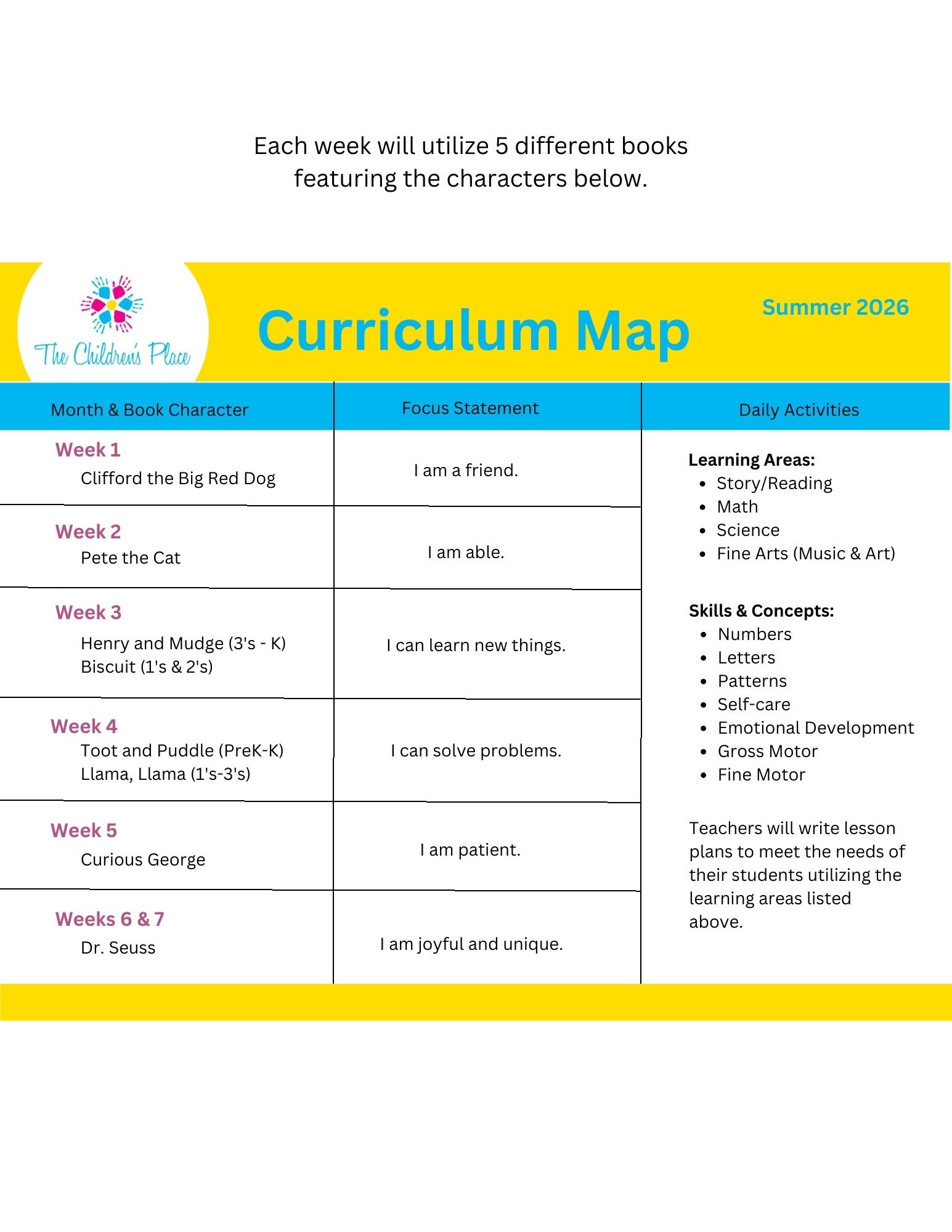 Weekly book character theme exploration through literature, fine arts, science, math, and recreation.